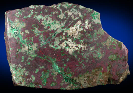 | Description: | Heavy slab of dark red-brown cuprite ore with veins of green malachite running throughout. One face was sawn flat to show the internal structure of the cuprite. Ex. Richard Hauck collection |