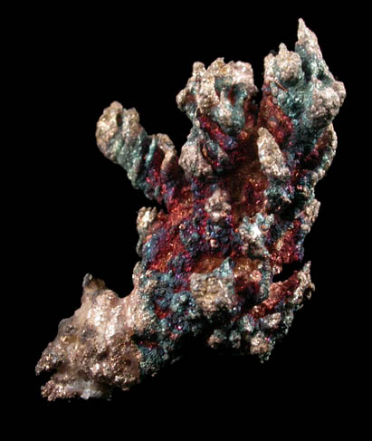 | Description: | Arborescent formation of lustrous rounded native silver crystals with iridescent tarnish on the surfaces. The bottom end of the silver formation has remnants of glue where they were previously mounted to a base. |