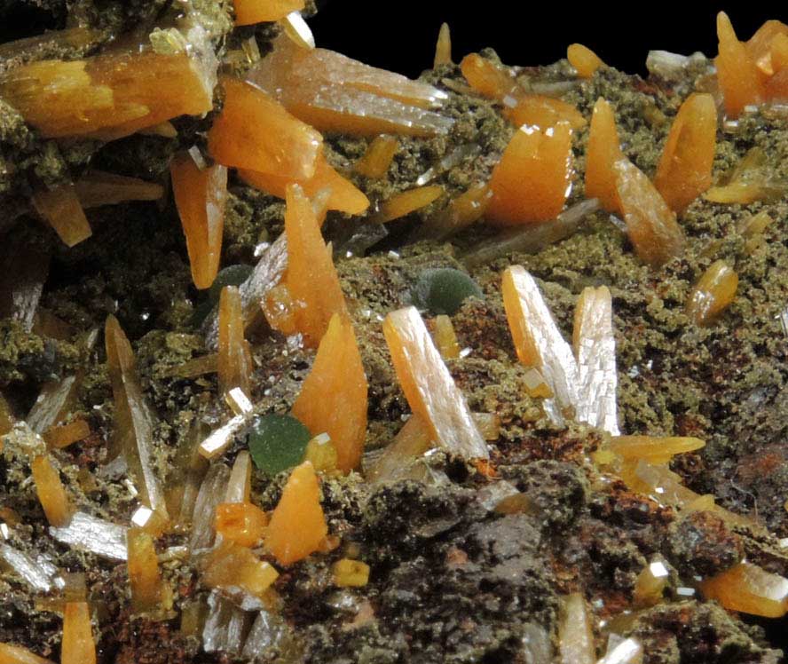 | Description: | Large cluster with translucent yellow wulfenite crystals to 10 mm long on brown limonite gossan with spherical green mimetite to 3 mm diameter and olive-green mottramite. The wulfenite crystals are unusual elongated four-sided pseudo-scalenohedron form. |