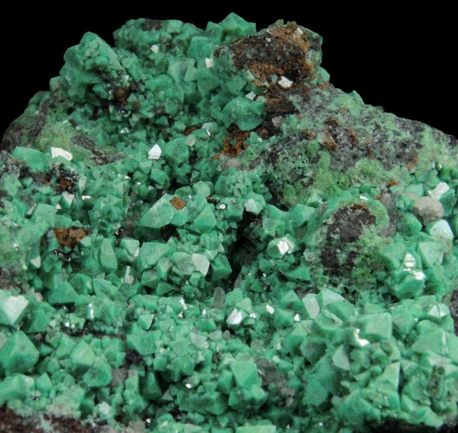 | Description: | Rich cluster of many translucent green cuproadamite crystals, the copper-rich variety of the mineral species adamite, up to 3 mm long with a few etched colorless quartz crystals to 2 mm long on brown gossan. Ex. Uli Bahmann collection |
