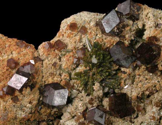 | Description: | Lustrous transparent brown dodecahedral andradite garnet crystals to 5 mm with sprays of translucent green epidote crystals to 3 mm on earthy brown matrix. Ex. W. Keller #9108 |