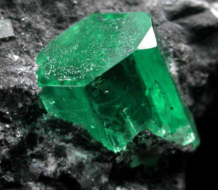 | Description: | Flawless (gem-grade) lustrous transparent deep-green emerald crystal, the green gem variety of the mineral beryl, dark gray matrix. The emerald crystal is stubby hexagonal with flat basal pinacoid termination. Could produce a 5x6 mm gemstone. |