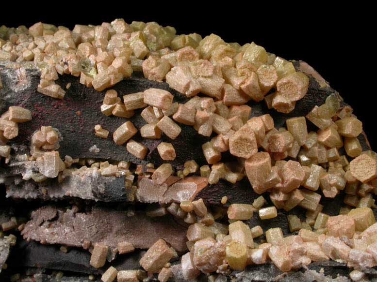 | Description: | Elongated specimen covered on all sides with translucent yellow-brown pyromorphite crystals with minor black goethite and grey cerussite microcrystals. The pyromorphite crystals are stubby hexagonal prisms with flat basal pinacoid terminations. Ex Jeff Weissman collection #760 |