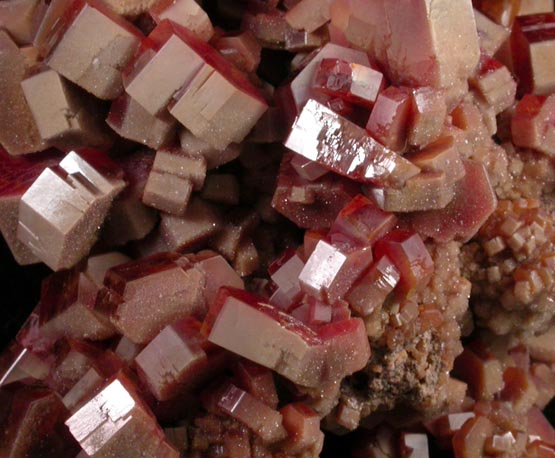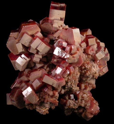 | Description: | Lustrous translucent red-brown vanadinite crystals with no matrix. The vanadinite crystals are tabular hexagonal form modified with thin second-order {110} prism edge faces. The rear crystal faces have brown color due to subsurface inclusions. |