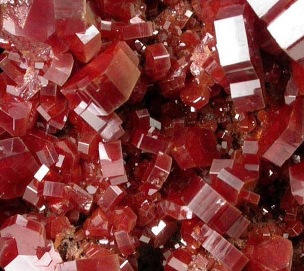| Description: | Unusually large lustrous translucent red vanadinite crystals on brown matrix. The vanadinite crystals are tabular hexagonal form and the rear crystal faces have brown color due to subsurface inclusions and coatings. |