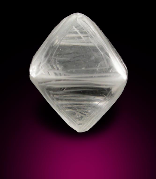 | Description: | Lustrous cuttable gem-grade transparent colorless natural diamond crystal with simple octahedral form and striated edges of stacked octahedral faces. The diamond has no flaws or inclusions. A textbook example of an octahedral natural diamond crystal. |