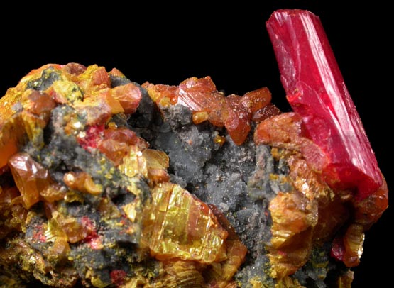 | Description: | Elongated 15 mm translucent vivid-red realgar crystal on crystallized yellow orpiment with small crusts of gray quartz microcrystals. The realgar might have been restored, but no glue is visible so I cannot verify. |