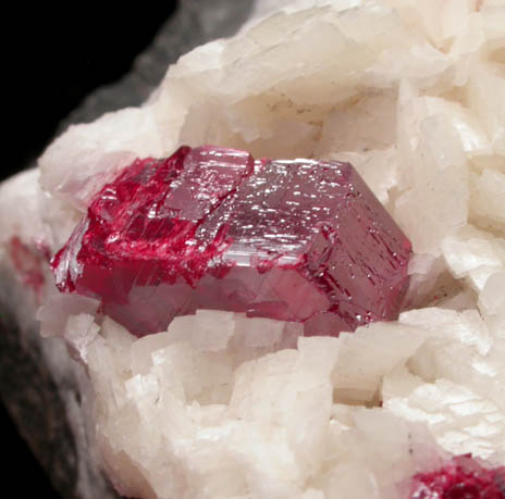 | Description: | Lustrous 15 mm translucent red cinnabar crystal on translucent white wedge-shaped dolomite crystals to 4 mm. The cinnabar crystal has fine crystallization patterns on the surfaces. |