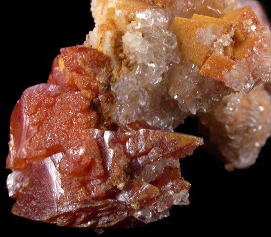 | Description: | Large lustrous translucent orange wulfenite crystals to 15 mm intermixed with rhombohedral transparent-to-translucent colorless calcite-aragonite crystals to 3 mm. The wulfenite crystals are square elongated di-pyramidal form {201}. |