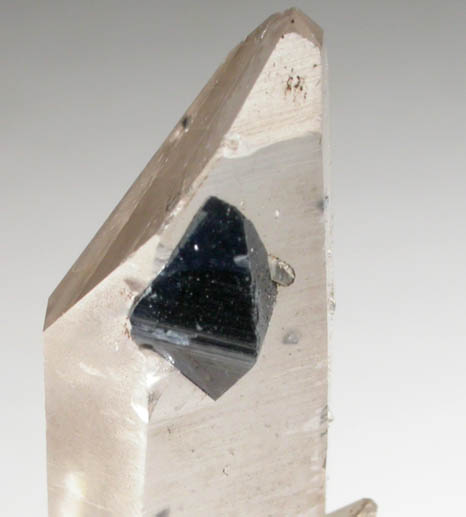 | Description: | Lustrous 8 mm di-pyramidal dark blue-black anatase crystal on a 40 mm transparent colorless quartz crystal with several smaller quartz crystals on the sides. The anatase crystal exhibits translucency when illuminated from the rear. Collected ca. 1995 |