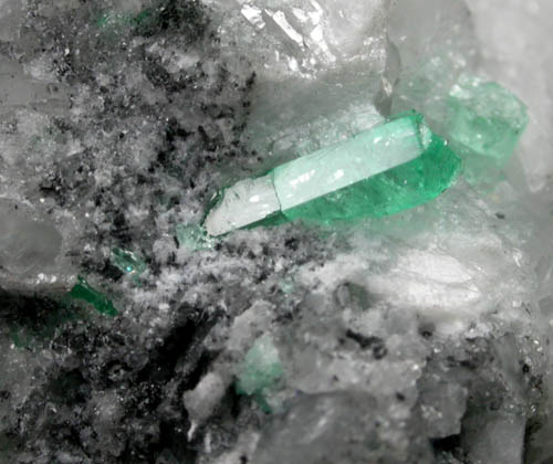 | Description: | Several lustrous transparent medium-green emerald crystals, the green gem variety of the mineral species beryl, embedded in translucent gray crystallized calcite. The emerald crystals are prismatic hexagonal form, the largest is incomplete. |