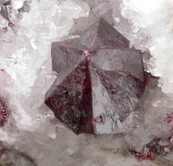 | Description: | Sharp, well-defined interpenetrant-twinned translucent dark-red cinnabar crystals to 11 mm on lustrous transparent colorless quartz crystals to 4 mm. The cinnabar crystals have a metallic-like surface luster caused by alteration. The twin tip is bruised. |