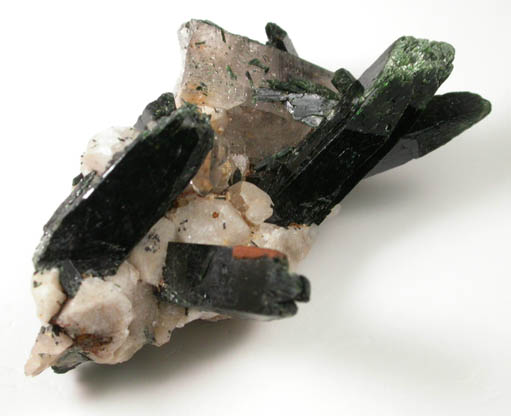 | Description: | Lustrous translucent dark-green elongated aegirine crystals to 17 mm with a partial crystal of lustrous transparent colorless quartz on translucent gray-white microcline crystals to 5 mm. Most of the aegirine crystals are terminated. |