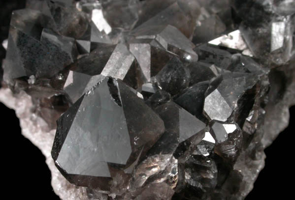 | Description: | Lustrous translucent black smoky quartz crystals on thin gray chalcedony that was part of a quartz geode. |