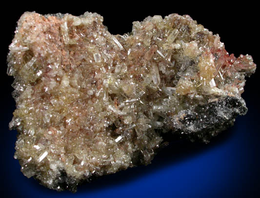 | Description: | Sparkling double-sided formation of lustrous transparent yellow mimetite crystals to 4 mm with microscopic gray galena inclusions in the mimetite crystals on one side. The mimetite crystals are tapered hexagonal form with pointed pyramidal terminations. |