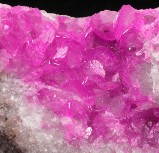 | Description: | Lustrous bright pink cobalt-rich dolomite crystals coating one face of matrix. Note: these specimens are often incorrectly labeled as cobaltian calcite, but a thorough survey and analysis in 1999 shows they should be labeled cobaltian dolomite. |