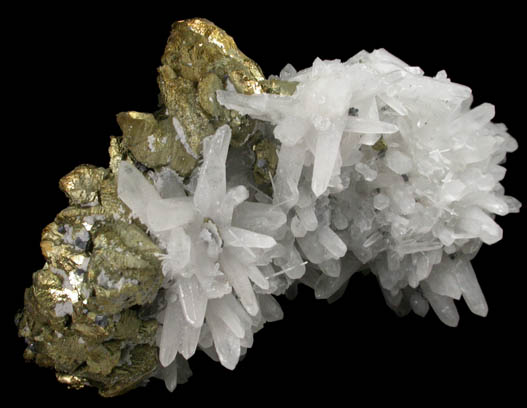 | Description: | Yellow-metallic chalcopyrite crystals to 15 mm one translucent milky quartz crystals to 14 mm. The chalcopyrite crystal surfaces have striated crystallization patterns. The cluster is fully crystallized on all surfaces with no apparent attachment point. |