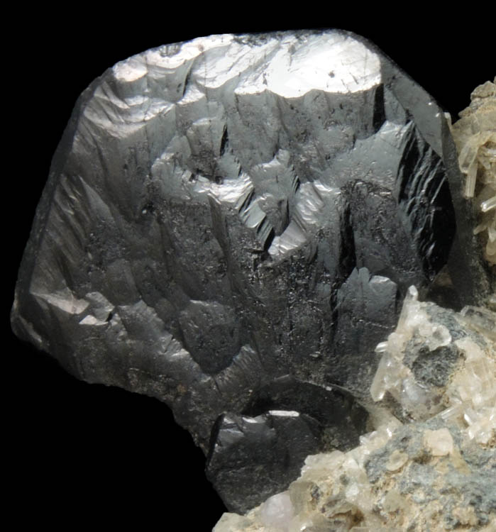 | Description: | Thin bladed ferberite crystal on gray matrix coated with lustrous transparent colorless quartz crystals to 4 mm. The ferberite crystal is black-metallic with complex crystallization patterns on the front prism face. |