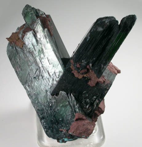 | Description: | Large V-shaped intersecting transparent green vivianite crystals with lustrous crystal faces intergrown with brown matrix. The vivianite crystals appear opaque black, but exhibit green transparency in the terminations when illuminated from the rear. |
