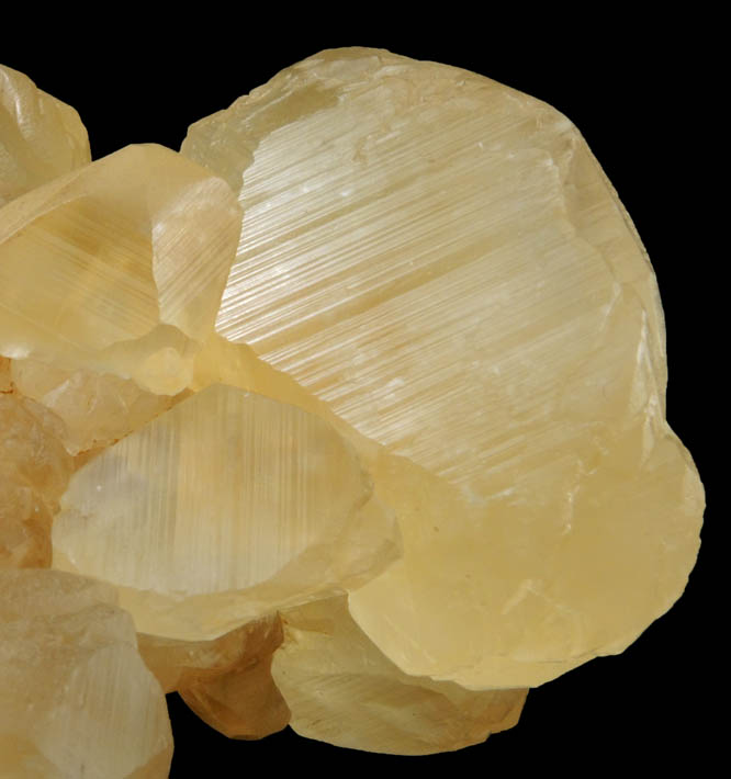 | Description: | Lustrous translucent-to-transparent golden yellow calcite crystals that are flatted rhombohedral form. Though it is difficult the see, the calcite crystals are twinned on {111} with twin planes visible around the perimeter of each twinned pair. Ex. Mort Metersky collection #Ca-943, director of International Calcite Collectors Association; originally acquired in 1995 |
