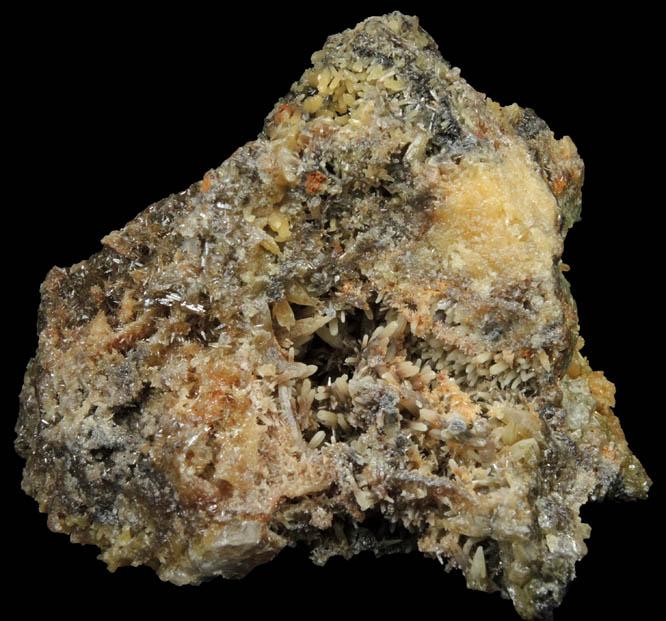 | Description: | Crystallized mass of mimetite and calcite with several cavities lined with lustrous translucent yellow mimetite crystals. The mimetite crystals are hexagonal prismatic form with pyramidal terminations. The mimetite crystals in the cavities are undamaged. Ex. Mort Metersky collection #Pb-55, director of International Calcite Collectors Association |