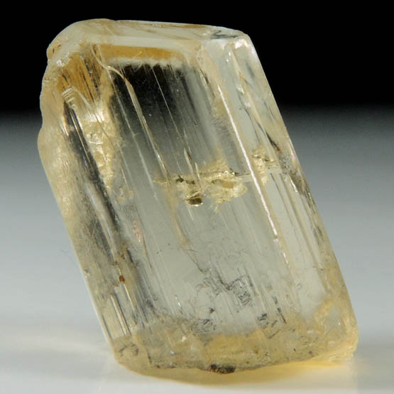 | Description: | Transparent gem-grade yellow prismatic scapolite crystal with striated prism faces and asymmetric termination. Scapolite is a mineral series composed of marialite (Na-rich) or meionite (Ca-rich). Ex. Mort Metersky collection. Weight: 1.6 grams |