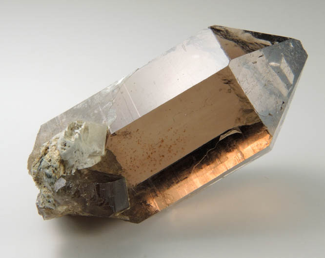 | Description: | Lustrous transparent smoky quartz crystal that is internally flawless. The smoky quartz crystal is twinned following the Dauphiné Law of Quartz Twinning with evident suture lines on the prism faces showing the twin sections. The rear is damaged. Ex. Mort Metersky collection |