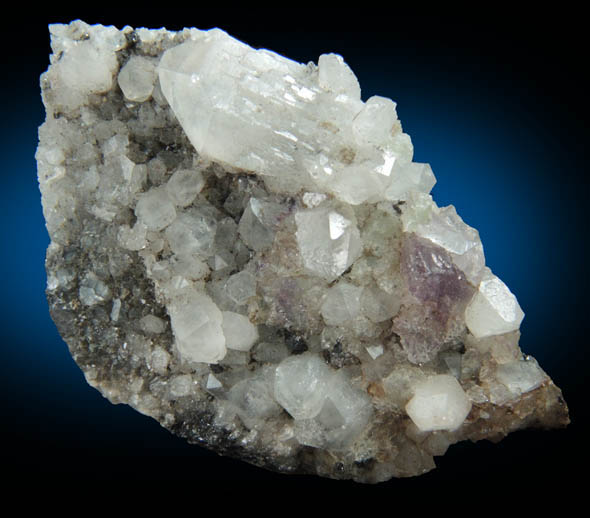 | Description: | Double-sided cluster of lustrous transparent gray quartz crystals to 10 mm with etched transparent purple-to-gray partial fluorite crystals to 5 mm and scattered black sphalerite crystals to 1 mm on sulfide-rich matrix. Ex. Thomas A. Penney (1934-2019) collection, collected in the 1970s by a construction worker at the site. |