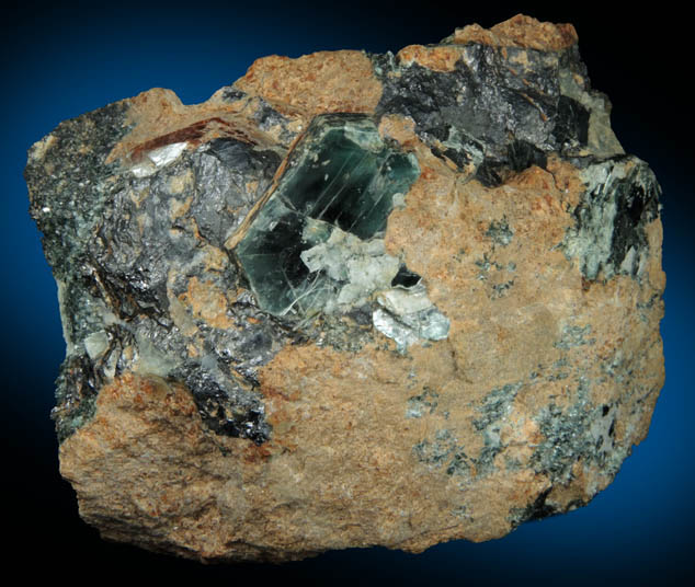 | Description: | Lustrous transparent dark-green clinochlore crystals to 25 mm with orange-brown chondrodite and black-metallic magnetite. This mine, famous for unusual mineralization and pseudomorphs, had a tragic cave-in in 1895 that led to the mine closing in 1897. Ex. Irving Horowitz collection #159; ex. Curt G. Segeler (1901-1989) collection #4 |