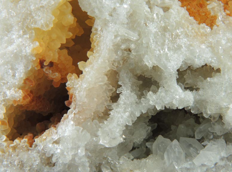 | Description: | Crystallized translucent white quartz with boxwork cavities lined with distinct quartz crystals to 7 mm, some coated with orange limonite. It is speculated these casts formed when quartz formed over another mineral that dissolved away (pseudomorphs). Ex. Morse collection |