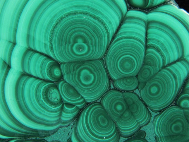 | Description: | Slice sawn through a stalactitic formation of green malachite polished flat on the front and rear to highlight the concentric growth patterns of the malachite. This malachite slice exhibits complex, lobed patterns. Front and rear show different patterns. |