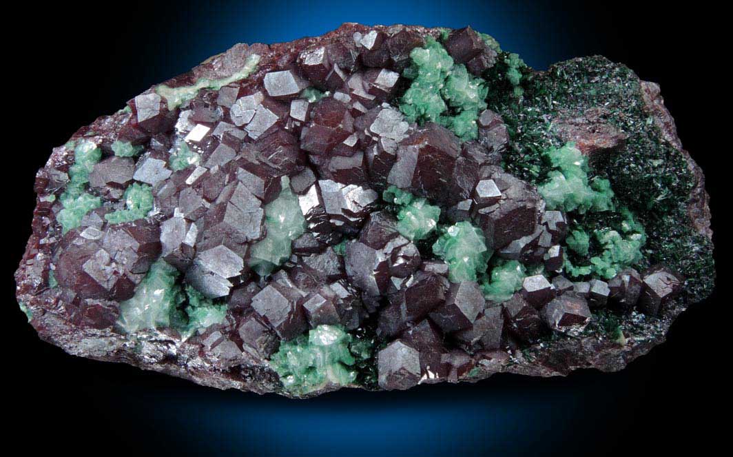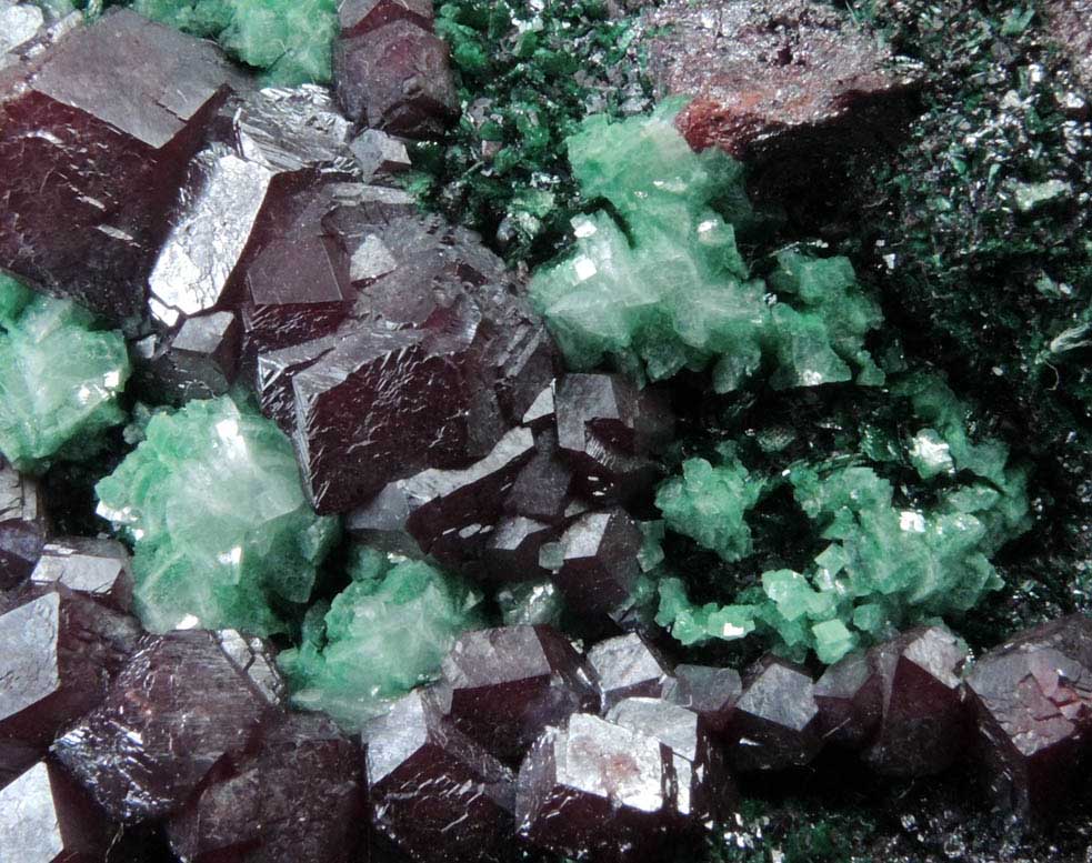 | Description: | Superb lustrous dark-red cuprite crystals to 7 mm with lustrous transparent green malachite crystals to 1 mm plus translucent white rhombohedral calcite crystals to 2 mm. The cuprite crystals exhibit red translucency when illuminated from the rear. Ex. Marshall Sussman in 2013 |