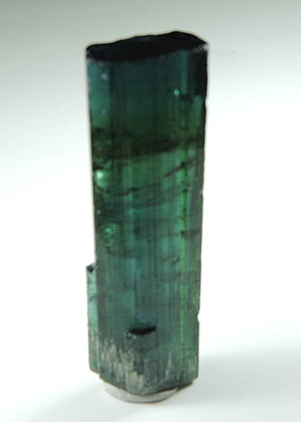 | Description: | Lustrous transparent elbaite tourmaline crystal with striated prism faces and flat basal pinacoid termination on the top end. The elbaite tourmaline crystal varies from green in the upper half to blue in the lower half. Weight: 14.4 grams |
