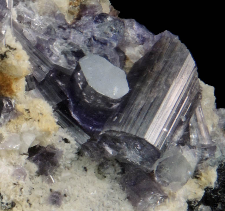 | Description: | Many lustrous transparent bi-colored fluorapatite crystals to 30 mm on white albite with small translucent pale-yellow to white bladed bertrandite crystals to 1 mm. The fluorapatite crystals vary from purple to bluish-gray. A large crystal was restored. Collected ca. 1980. Restored one place |