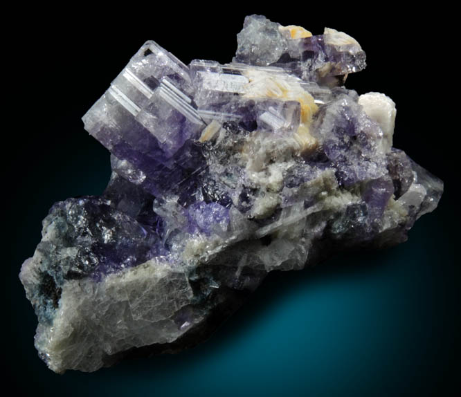 | Description: | Lustrous transparent purple to grayish-green fluorapatite crystals to 8 mm with platy pale-yellow bertrandite crystals to 2 mm. The fluorapatite crystals are prismatic form, with striated prism faces and flat basal pinacoid terminations. Collected ca. 1980 |
