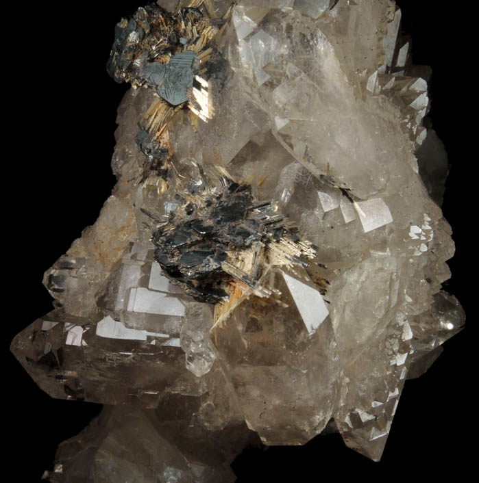 | Description: | Complex cluster crystallized on all sides of lustrous transparent smoky quartz crystals to 35 mm with platy black-metallic hematite crystals to 10 mm with epitactic intergrown straw-yellow metallic rutile crystals to 5 mm included in the quartz. |