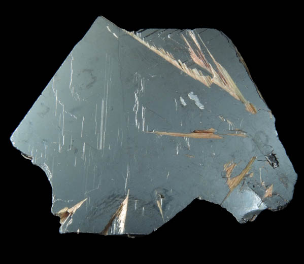 | Description: | Lustrous flat gray-metallic hematite crystal with inclusions of yellow-metallic rutile crystal in epitactic orientation. The hematite crystal is a portion of a hexagon, with flat outer faces. The growth on one edge was interrupted by the rutile crystals. Collected ca. 1985 |