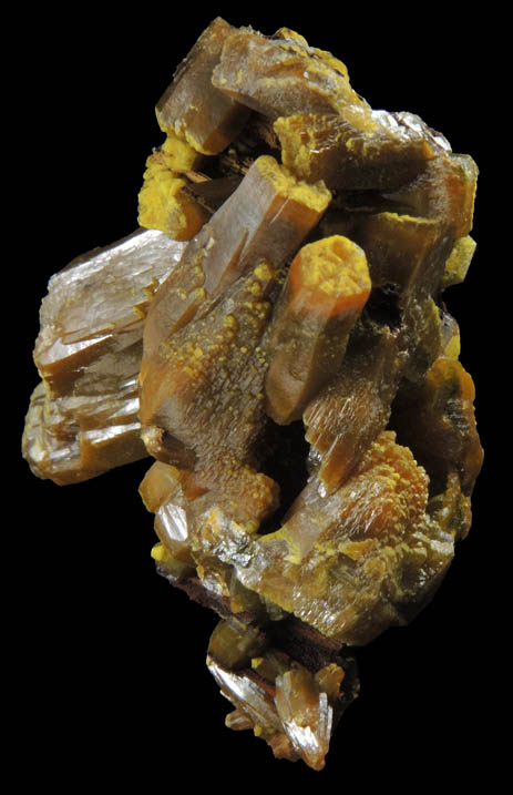 | Description: | Lustrous translucent brown pyromorphite crystals with yellow termination zones on the ends. The pyromorphite crystals are tapered hexagonal prismatic form, with pyramidal terminations composed of many smaller parallel faces. |