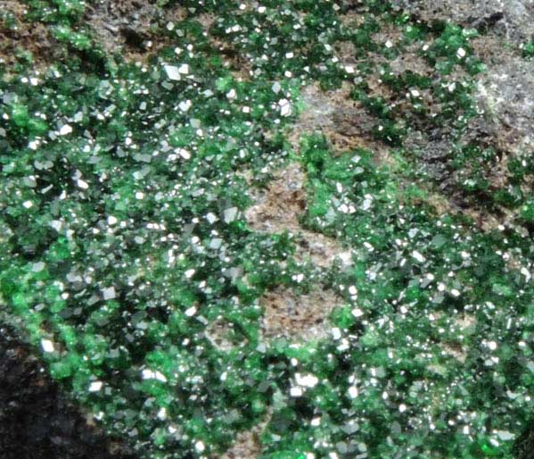 | Description: | Lustrous transparent green dodecahedral uvarovite garnet crystals covering one face of gray basalt. |