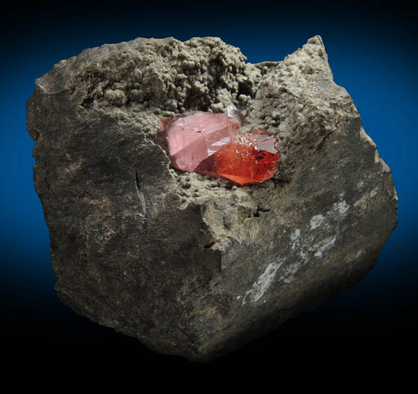 | Description: | Lustrous transparent red rhodochrosite against a translucent pink rhodochrosite crystal in a small cavity on Mn-oxide matrix. |