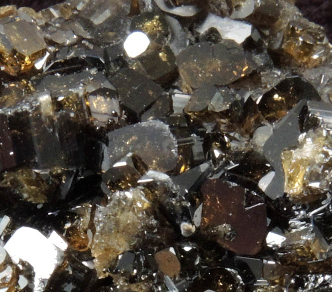 | Description: | Thin plate of lustrous transparent dark yellow-brown vesuvianite crystals with small crystal faces covering the rear. The vesuvianite crystals are short prismatic form with striated prism faces and flat basal pinacoid terminations. |