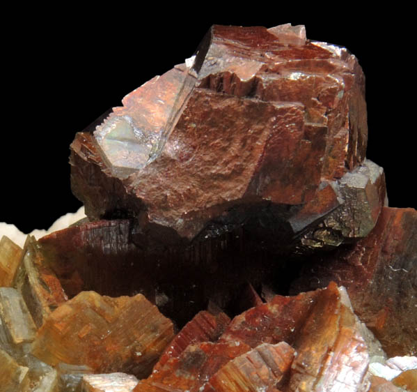 | Description: | Metallic chalcopyrite crystals (rare from this locality) to 6 mm in a cluster 15 mm across on lustrous translucent greenish-brown siderite crystals to 9 mm over white dolomite. The chalcopyrite crystals have a red-brown surface coating (micro cuprite?) |