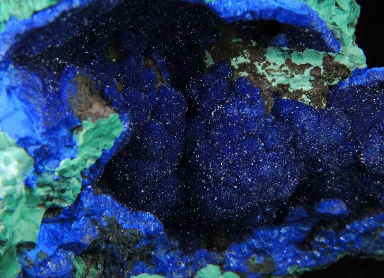 | Description: | Colorful pockets of sparkling blue azurite microcrystals to 0.1 mm lining shallow cavities in green malachite. There are two cavities of azurite crystals and the contrast of the blue azurite against the green malachite is very aesthetic. |