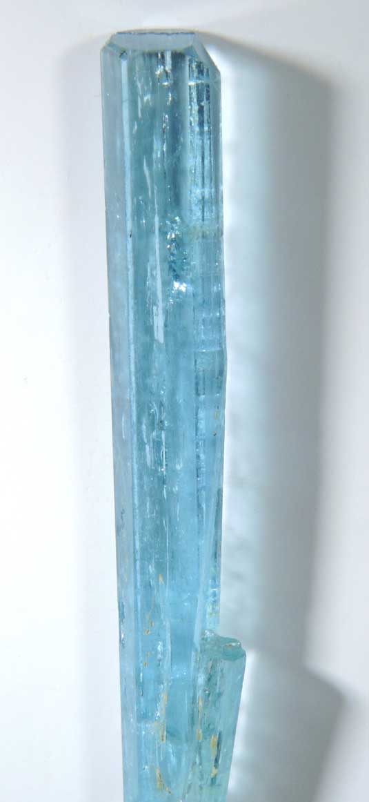 | Description: | Lustrous transparent blue aquamarine crystal, the blue gem variety of the mineral species beryl, with glassy crystal faces and basal pinacoid termination modified by secondary corner faces. The aquamarine crystal is an extraordinary intense blue color. Weight: 11.8 grams |