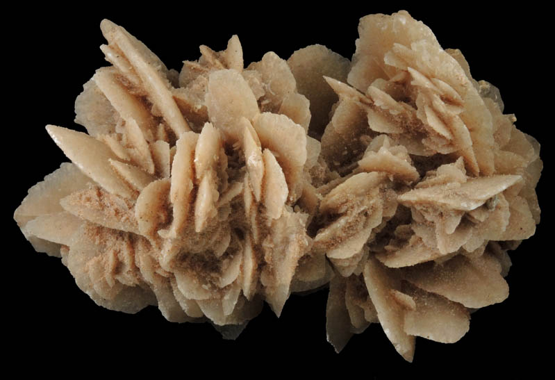 | Description: | Two intersecting clusters of translucent tan-colored bladed gypsum crystals in spherical formation with crystals on all sides. These gypsum formations are called Desert Roses and they form in the sulfate-rich playa (seasonally dry lake bed). |