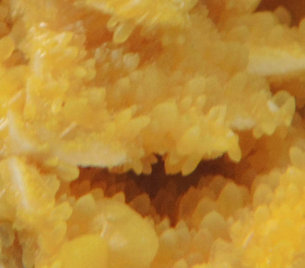 | Description: | Twisted rhombohedral dolomite crystals to 6 mm with coating of translucent vivid-yellow smithsonite crystals to 0.2 mm. When viewed under magnification the smithsonite crystals can be seen to be many hemispherical crystals and larger crystal rosettes. Ex. Mort Metersky collection |