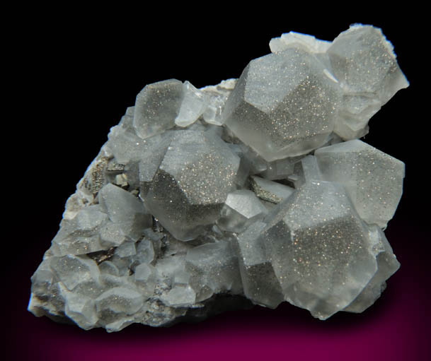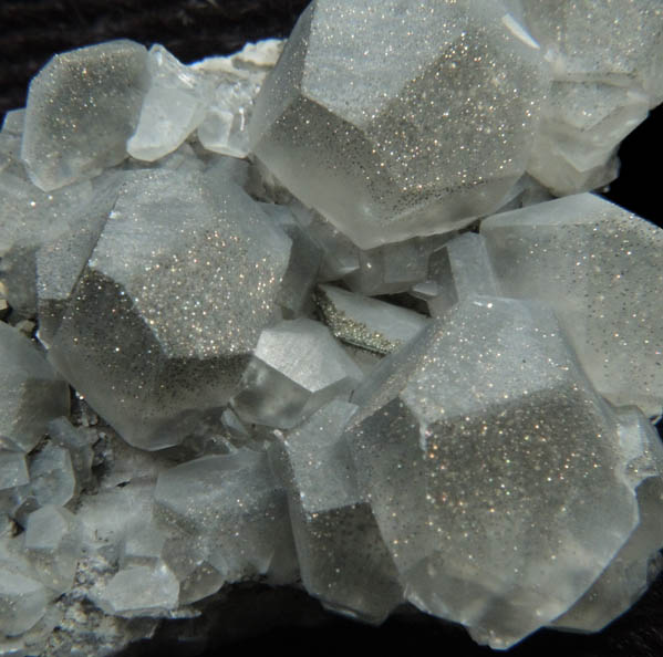| Description: | Plate of translucent gray calcite crystals to 7 mm with scattered overgrowth of microscopic metallic pyrite crystals to 0.03 mm. The calcite crystals are stubby hexagonal form with rhombohedral termination faces. Ex. Mort Metersky collection |