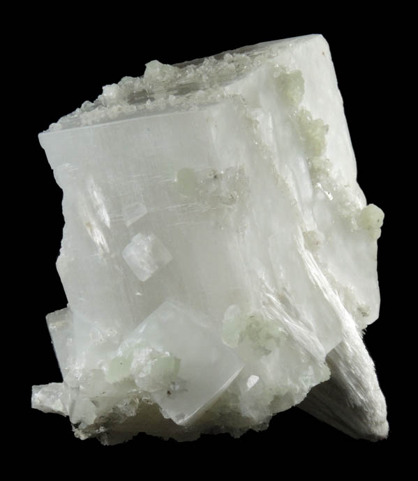 | Description: | Large 34 mm rectangular translucent gray-white apophyllite crystal with a tapered mass of acicular white pectolite crystals to 26 mm and scattered translucent green prehnite spheres to 2 mm plus many smaller colorless apophyllite crystals. Ex. St. Lawrence University Collection; ex. Howard E. Moore (1926-2011) |