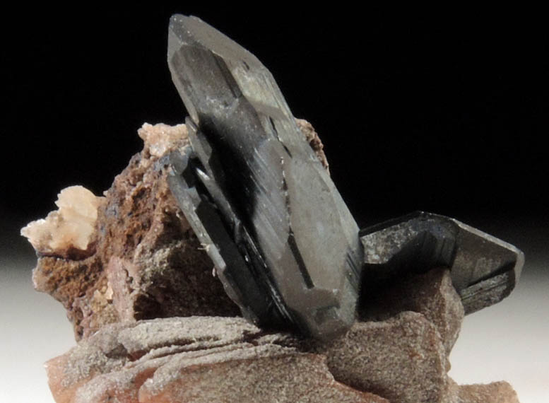 | Description: | Sharp well-crystallized dark-metallic chalcocite crystals on translucent red-brown matrix (calcite?). The chalcocite crystals are platy pseudohexagonal form that are V-twinned. |