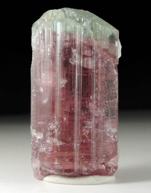 | Description: | Lustrous bi-colored elbaite tourmaline crystal with minor white albite on the surfaces in small areas. The elbaite crystal is mostly bright pink, with a 5 mm green zone at the termination. One corner was repaired where a fragment came loose. Weight: 9.4 grams. Gift of Dale Sweatt, one of the original partners in the famous 1972-3 tourmaline discovery |